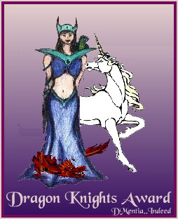 The Dragon Spirit award comes to the Sanctuary from SpiritWolf. They said "You have done a great job with your pages... it shows that you care how your work comes across... I love how your pages come together... Thanks for the nice tour around." Thankyou and you're welcome! This wonderful award comes directly from Ocelot and this is what (among other things) she had to say: "I visited your site and I noticed I'm on your link list multiple times. Thanx! I really appreciate it. Your site is very well done and I'd love to give you an award, course thats means I'll have to get of my butt.... wait no I wont... it just means I have to make one. *goes to program and makes award*" The pleasure's all mine Ocelot! ::smiles:: This amazing award comes from DragginMama, wanna know what she had to say? 'Tis pleased I am to present thee with DragginMama's "Special Golden Award of Excellence"! Zounds!! What a magnificent kingdom thou hast created! Most impressive indeed! Well Done M'Lady! Thankyou beyond all Dragginmama! Another award from DragginMama!! She sent this specially and wrote this: You've truly touched this Draconian heart. So much so that I just had to create an even more grand award for thee. Thus . . .